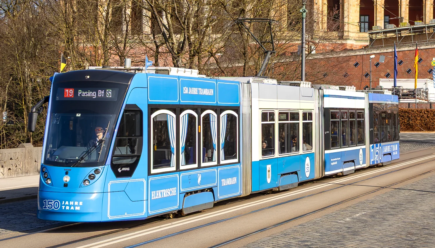Unsere vierteilige Tram vom Typ Avenio (T‑Wagen) feiert „150 Jahre Tram in München“ in einer besonderen Jubiläumsoptik. Jeder Wagenteil steht für eine eigene Ära – zusammen ergibt das eine vergnügliche Reise durch Münchens Tram-Geschichte: