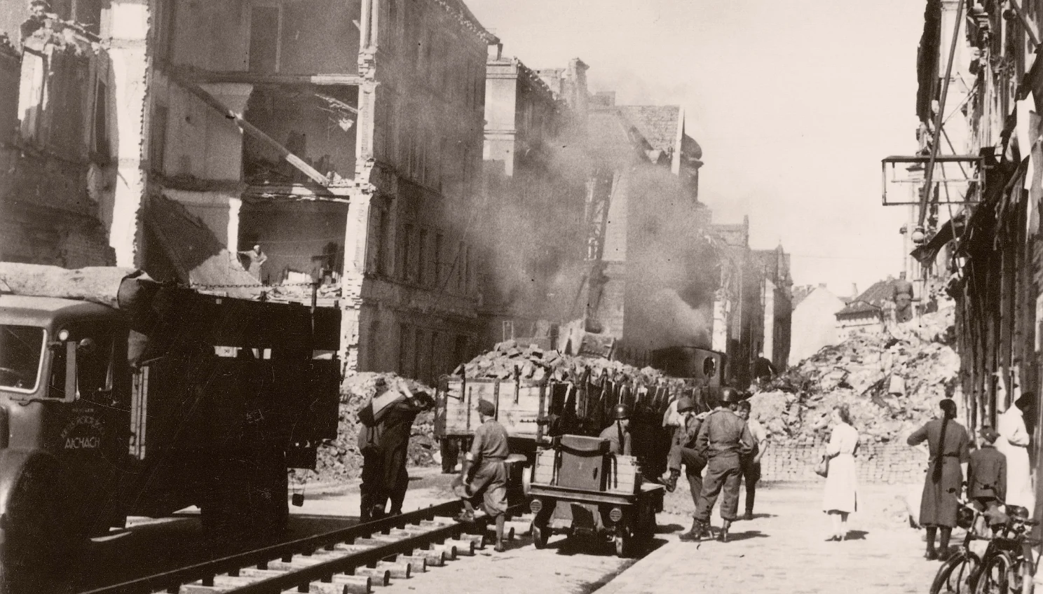 Dieser Krieg traf die Stadt und die Tram noch härter. Bomben zerstörten Fahrzeuge, Gleise und Werkstätten. Am 30. April 1945 waren weniger als die Hälfte der Wagen einsatzbereit und nur ein Drittel des Schienennetzes befahrbar. Doch auch diesmal war die Tram Teil des Wiederaufbaus: Noch im Mai 1945 nahm sie ihren Betrieb wieder auf, zunächst mit halber Kraft. Im Zuge der Entnazifizierung tauschte die US-amerikanische Militärregierung das Führungspersonal der Städtischen Verkehrsbetriebe aus. 1950 war das Streckennetz wieder nahezu auf Vorkriegsstand. Und die Trambahn spiegelte das Münchner Lebensgefühl, wie es der Volkssänger Weiß Ferdl in seinem Spottlied „Ein Wagen von der Linie 8“ von 1949 verewigt hat.