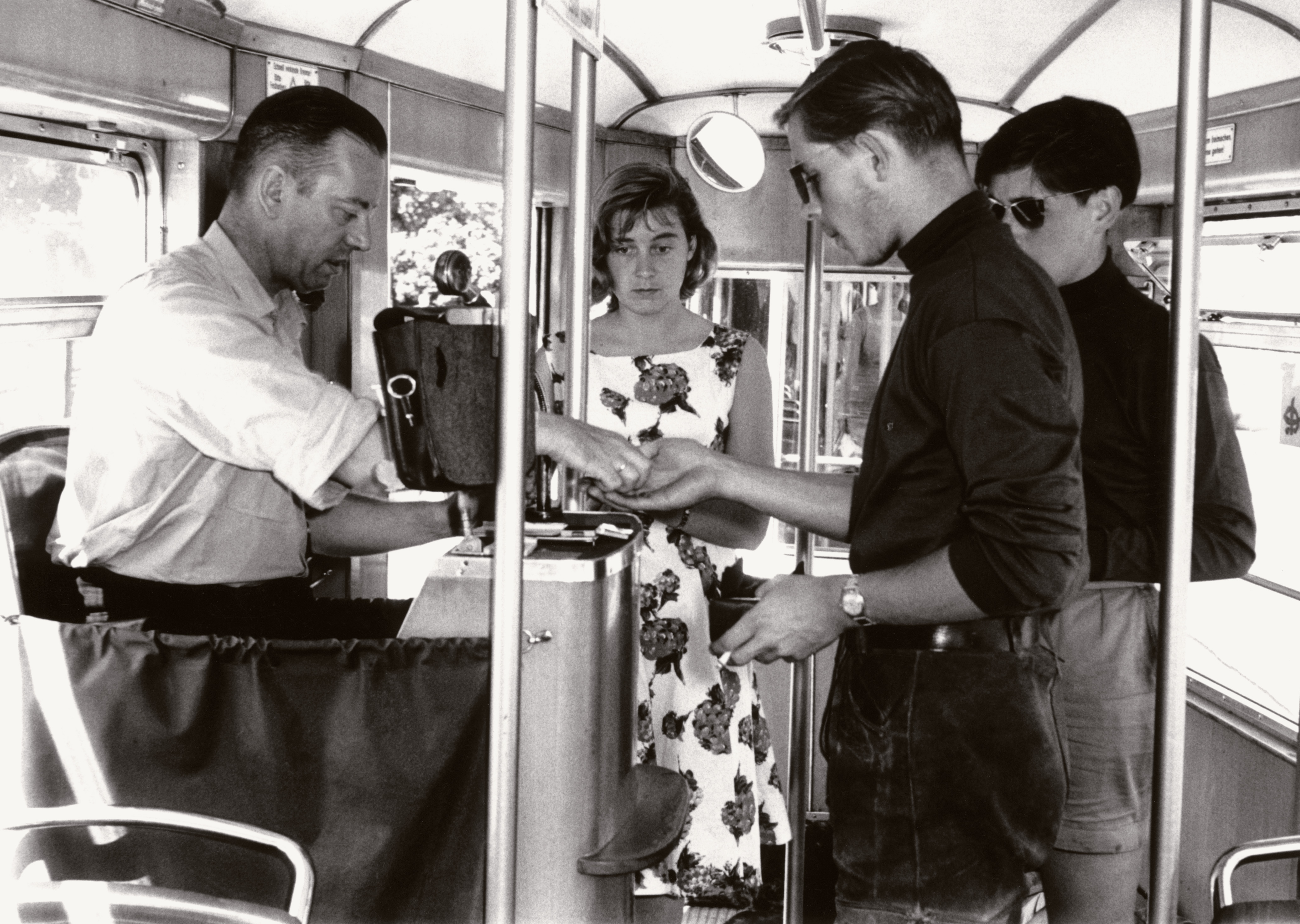 Schaffner, nicht zuletzt durch Weiß Ferdls Lied unsterblich im städtischen Gedächtnis, waren feste Begleiter in jeder Straßenbahn: Sie verkauften Fahrkarten, sagten Haltestellen an und halfen beim Ein- oder Ausstieg. Konkurrenz kam 1959 in Form eines stummen, blauen, mannshohen Kastens am Stachus: Der Fahrkartenautomat. Mit dem Erfolg der Automaten verschwand der Schaffner-Beruf.