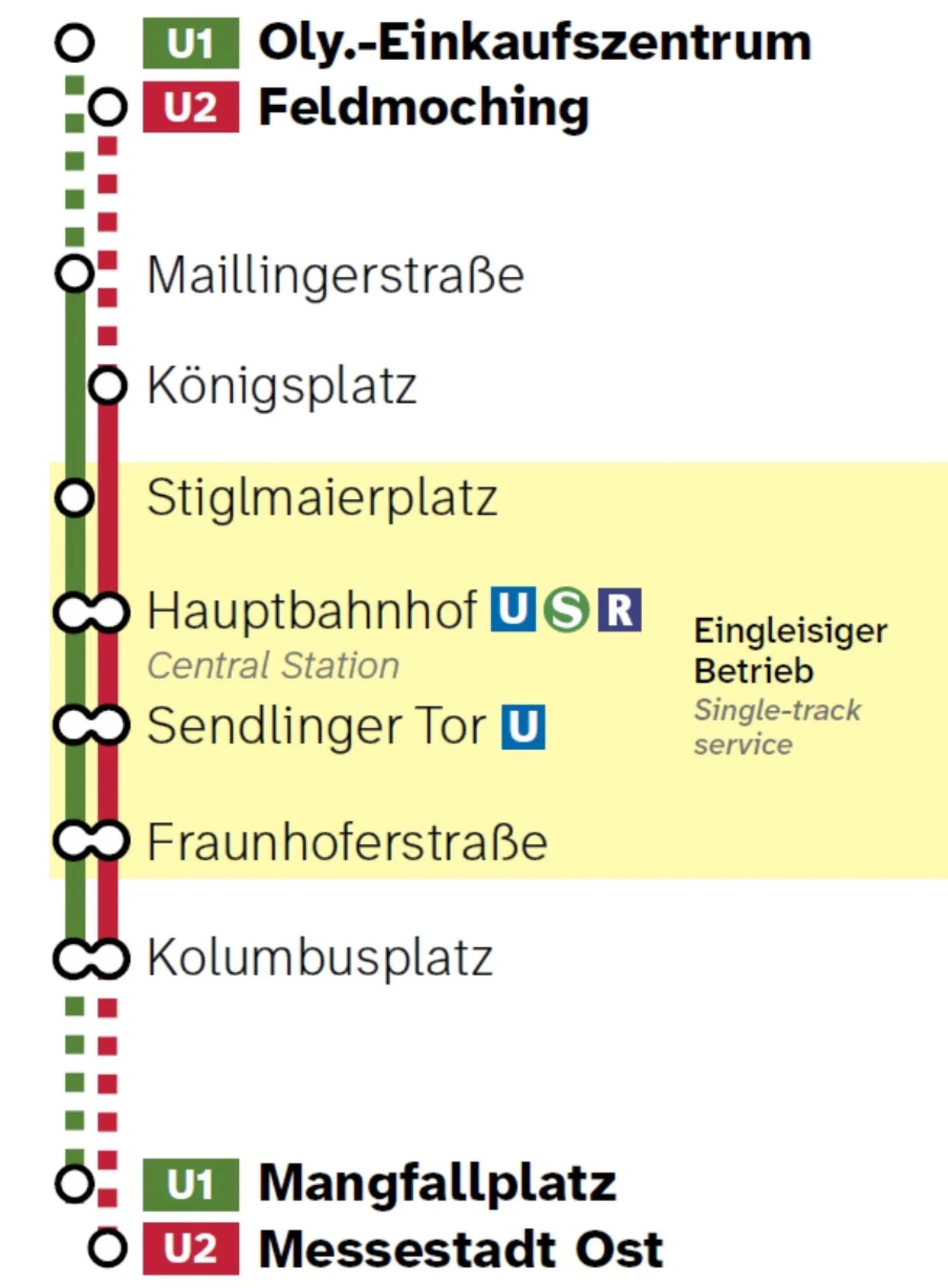 An den Bahnhöfen Stiglmaierplatz, Hauptbahnhof, Sendlinger Tor und Fraunhoferstraße fahren die U-Bahnen in alle Richtungen vom selben Gleis ab.