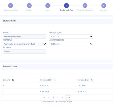 Nach der Prüfung Ihres Studierendenstatus haben sie die Möglichkeit den Vertragsbeginn und das Vertragsende anzugeben. Darüber hinaus werden Ihnen noch die „Shibboleth-Daten“ angezeigt. Diese Daten enthalten die Gültigkeiten der Semester, für die sie das Ermäßigungsticket bestellen können.