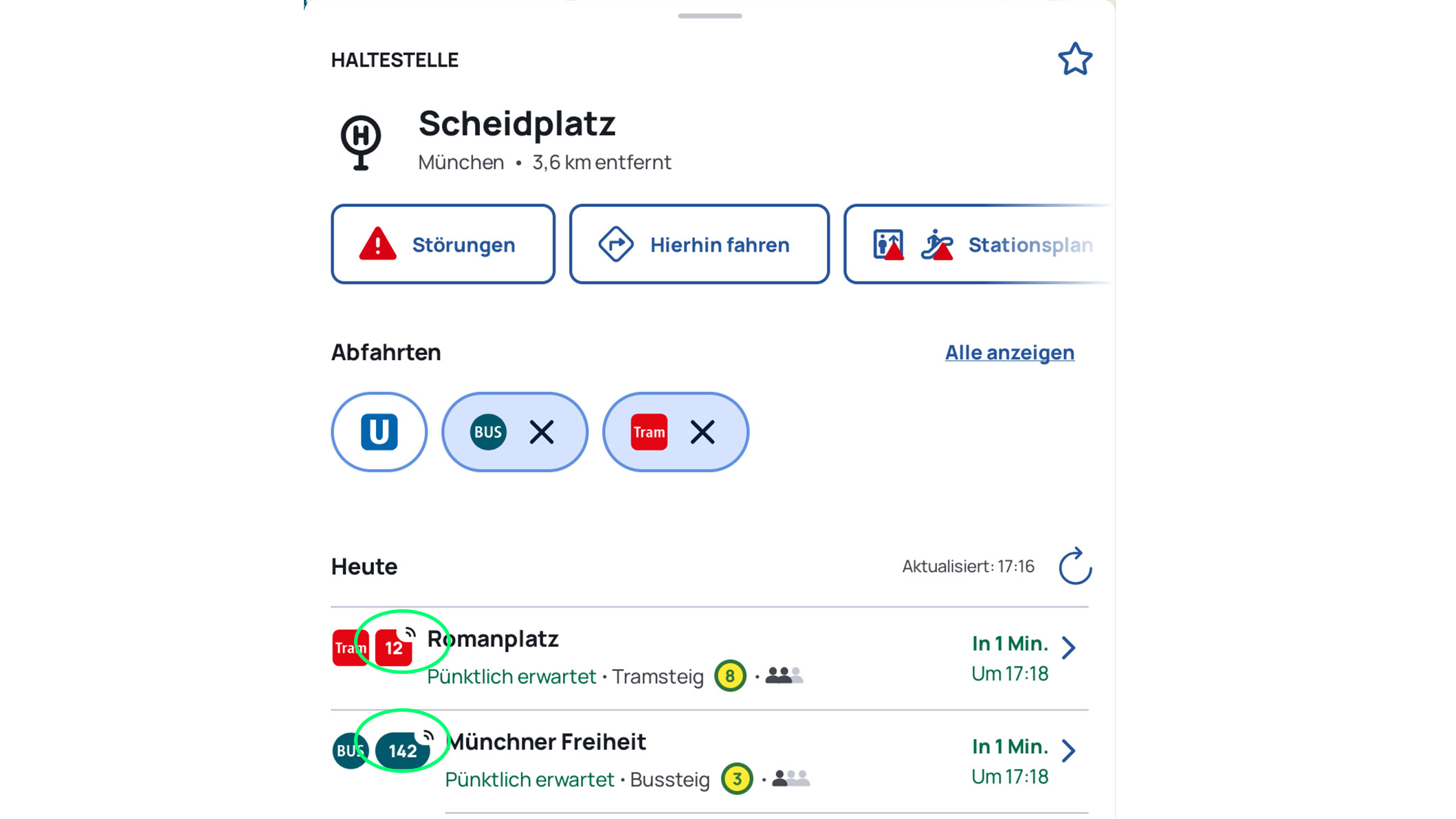 2. Prüfen, ob die Live-Position verfügbar ist (zu erkennen am Signal-Zeichen in der rechten oberen Ecke der Liniennummer)
