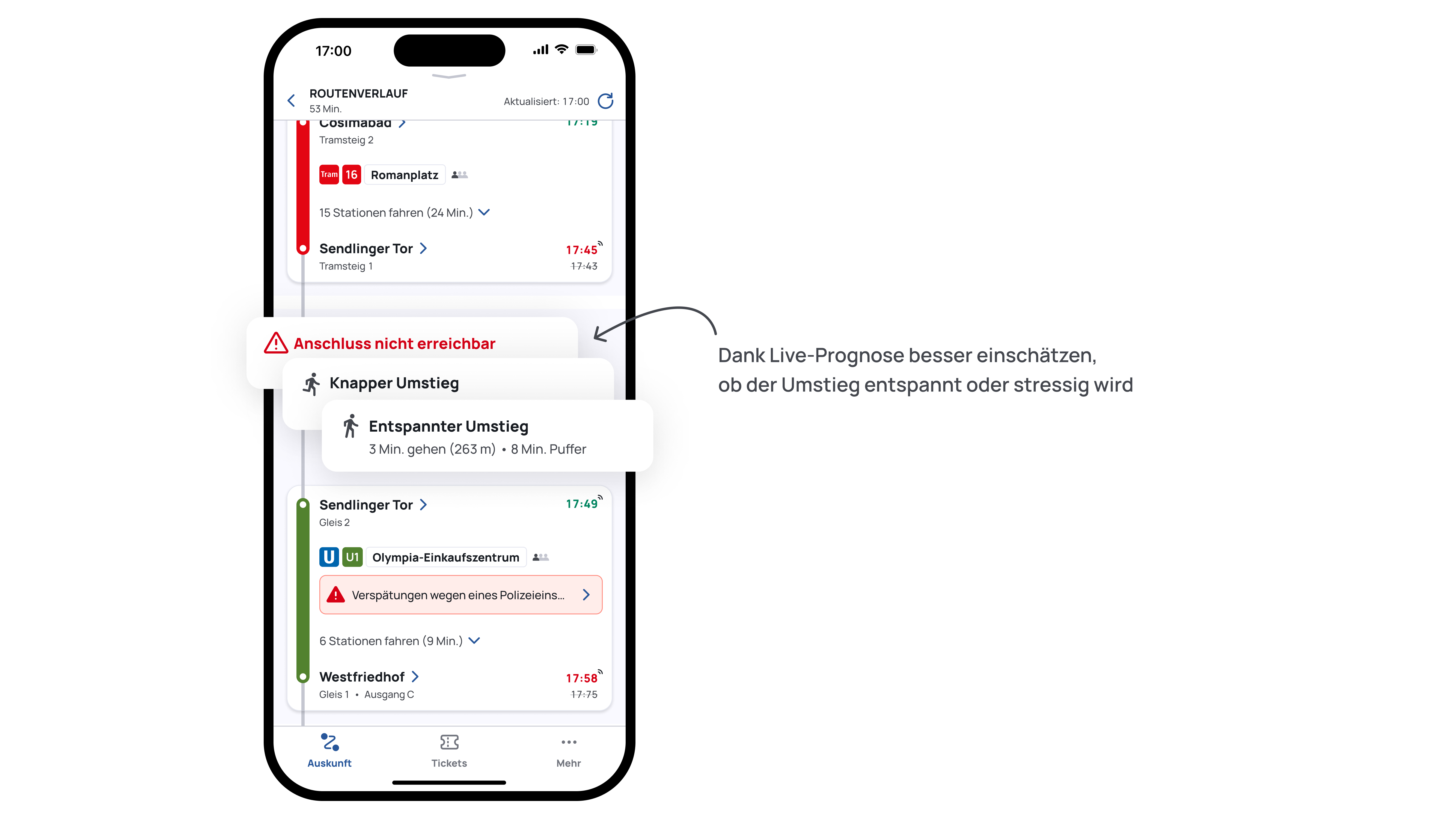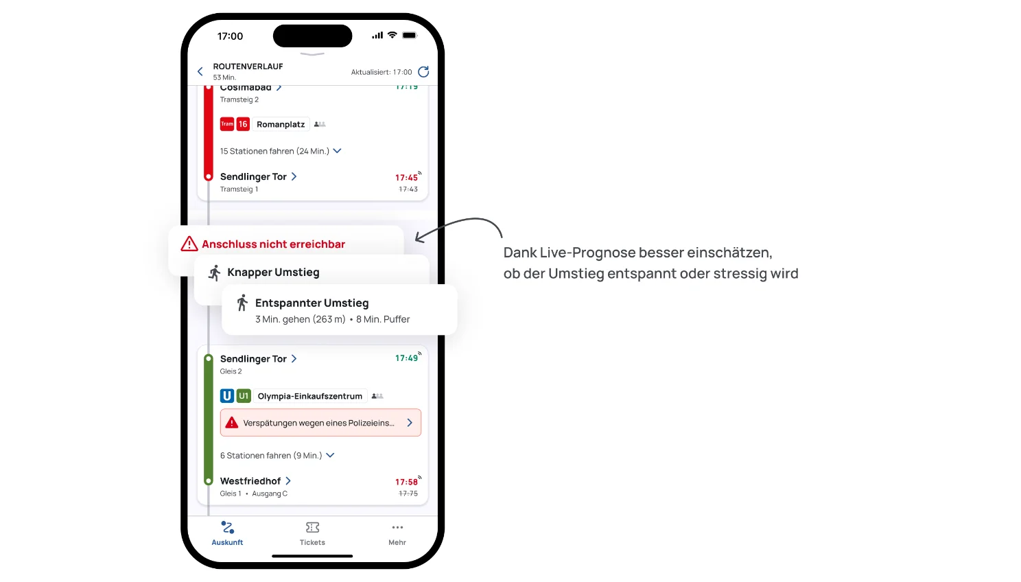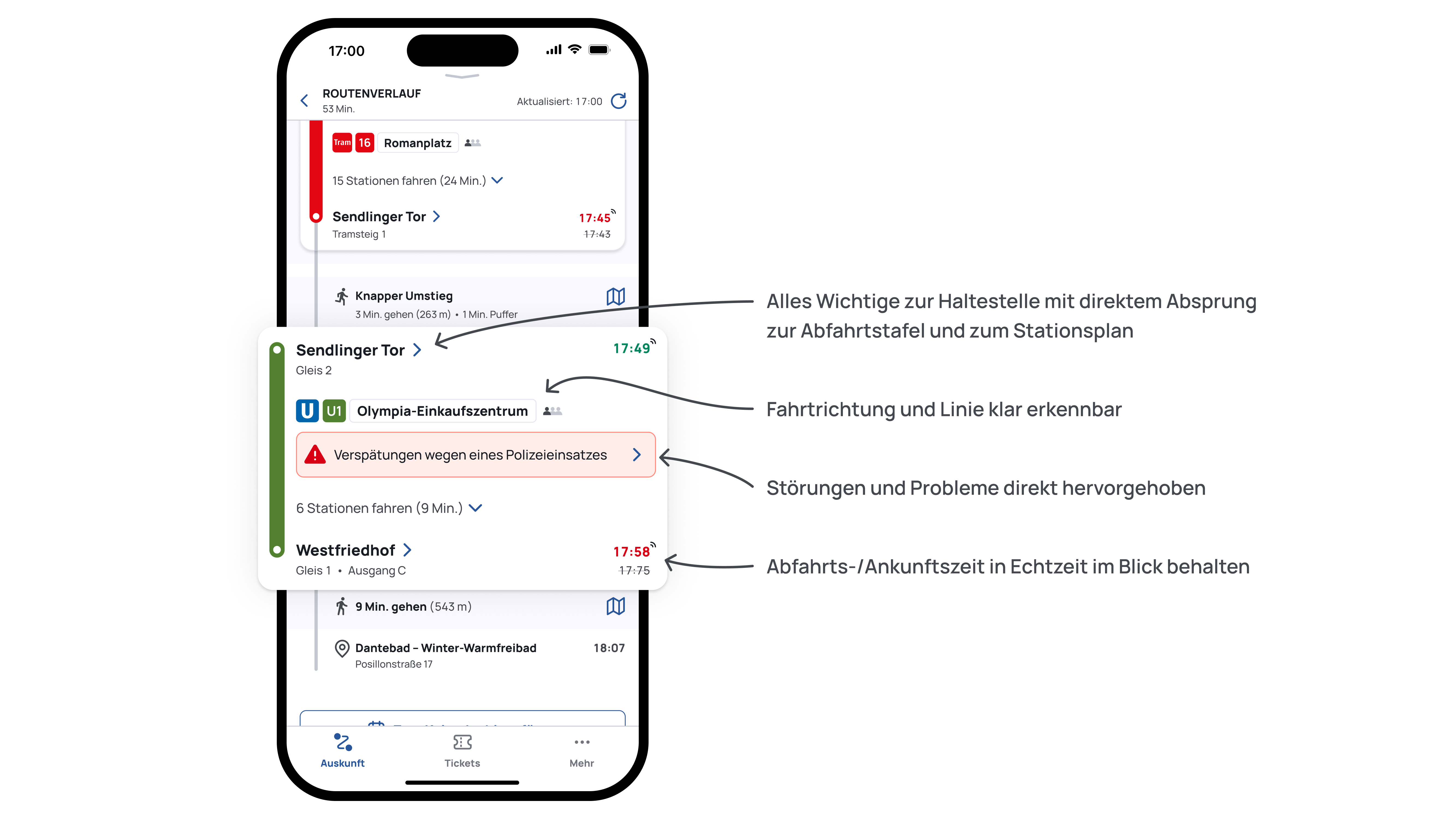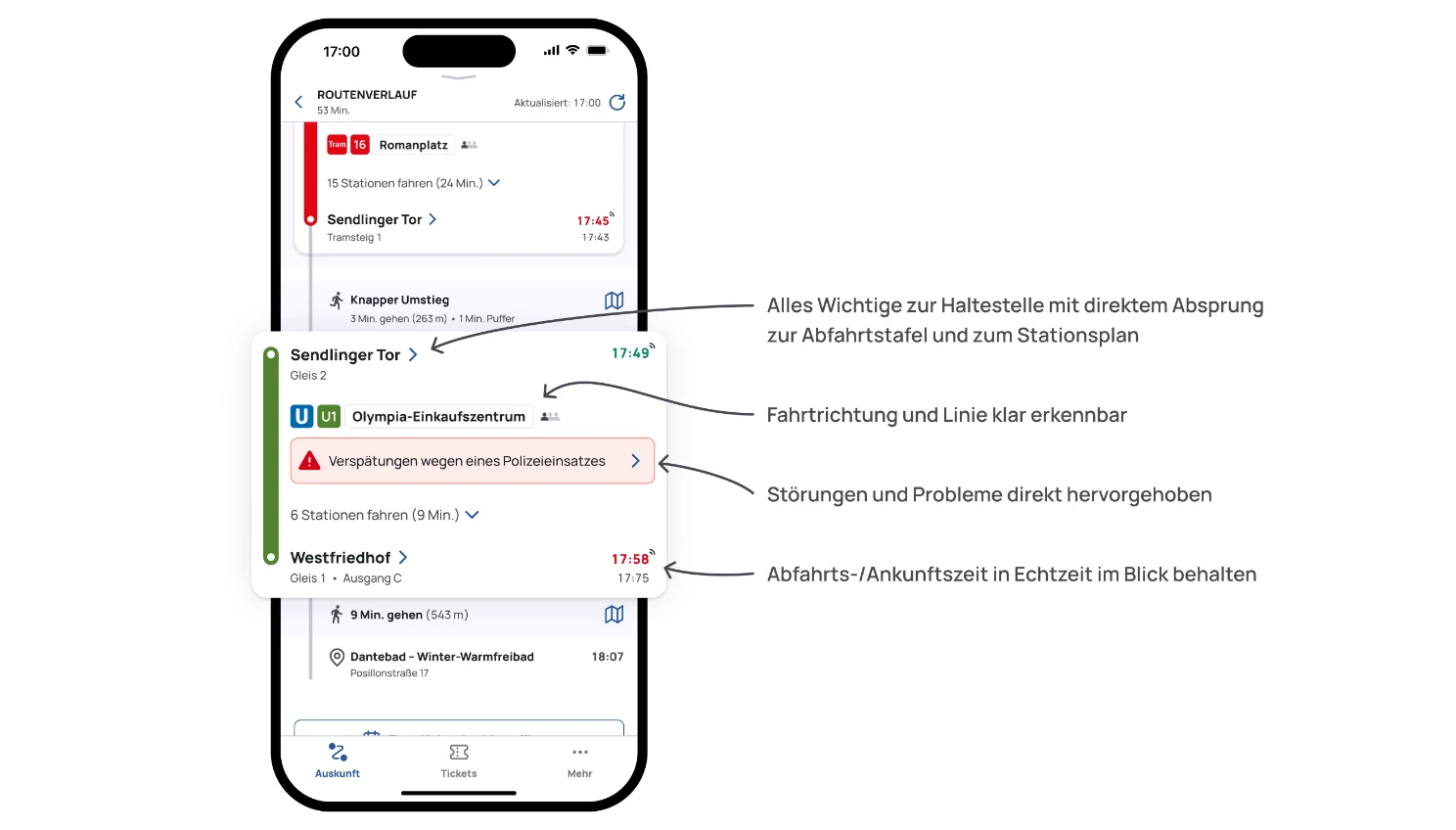 Alle Fahrtdetails übersichtlich dargestellt: Alle wichtigen Angaben zu einer Haltestelle, wie Zeiten, Bahnsteig oder Ausgang finden Sie kompakt an einem Ort. Bei Abfahrts- und Ankunftszeiten sehen Sie jetzt noch deutlicher, ob Ihr Verkehrsmittel pünktlich, verspätet oder ohne Echtzeitdaten unterwegs ist. Darunter werden die Linieninformation (Verkehrsmittel, Liniennummer, Zielhaltestelle) gebündelt dargestellt - genauso übersichtlich wie Start - und Zielhaltestelle.