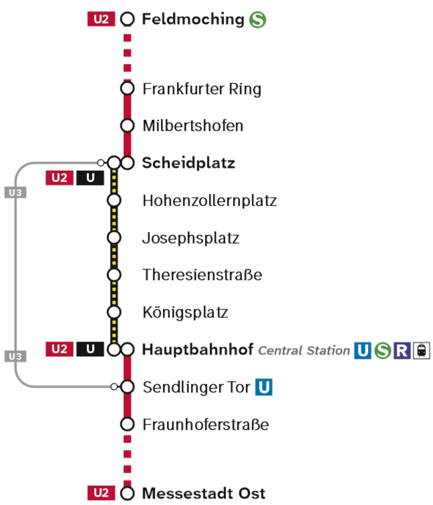 Am Scheidplatz ist zur Weiterfahrt ein Umstieg über das Zwischengeschoss notwendig. An den Bahnhöfen Hohenzollernplatz, Josephsplatz, Theresienstraße und Königsplatz fahren die Züge in alle Richtungen vom selben Gleis.