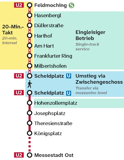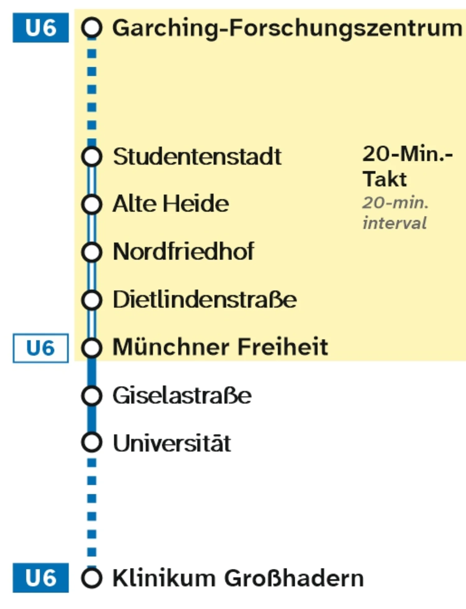 - Garching-Forschungszentrum / Fröttmaning <> Sendlinger Tor (10-Minuten-Takt)