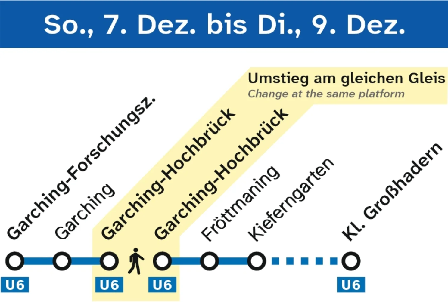 Von Sonntag bis Dienstag erfolgt die Teilung der U6 in Garching-Hochbrück. Die U6 fährt dann in folgenden Abschnitten: