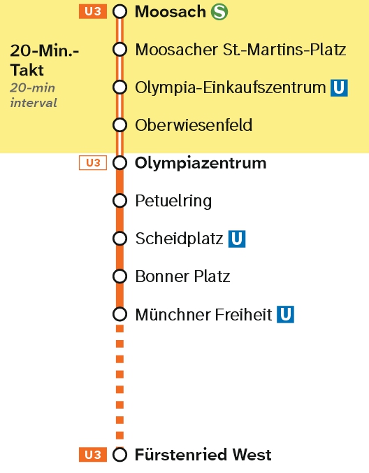 • Moosach <> Münchner Freiheit <> Sendlinger Tor (10-Minuten-Takt)