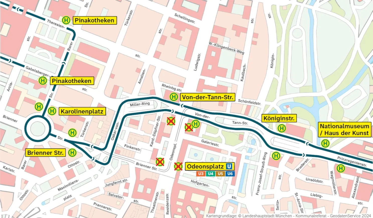 Die (H) Von-der-Tann-Straße ist in Richtung Hauptbahnhof Nord in den Oskar-von-Miller-Ring verlegt, in Richtung Ostbahnhof halten die Busse in der Von-der-Tann-Straße.