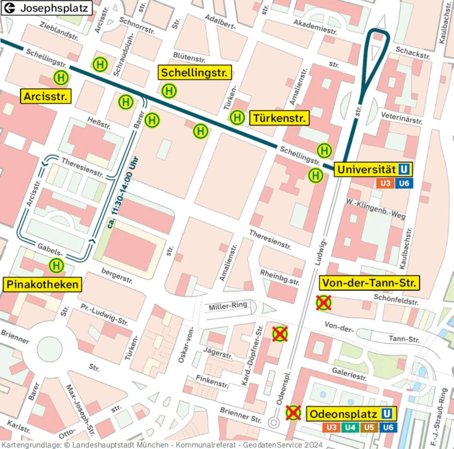 Die (H) Schellingstraße ist in diesem Zeitraum an die Haltestelle der Tram 27 > Petuelring / 28 > Scheidplatz in der Barer Straße verlegt, die (H) Türkenstraße und Universität entfallen.