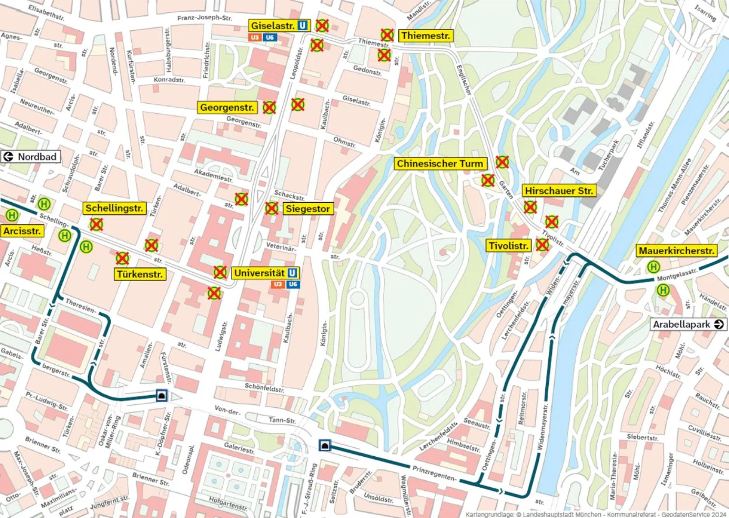 Die (H) Türkenstraße, Universität, Siegestor, Georgenstraße, Giselastraße, Thiemestraße, Chinesischer Turm, Hirschauer Straße und Tivolistraße entfallen.