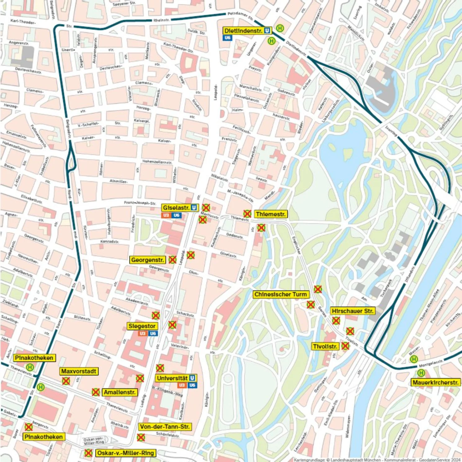 Die (H) Tivolistraße, Hirschauer Straße, Chinesischer Turm, Thiemestraße, Giselastraße, Georgenstraße, Siegestor, Universität, Amalienstraße und Maxvorstadt (Sammlung Brandhorst) entfallen.