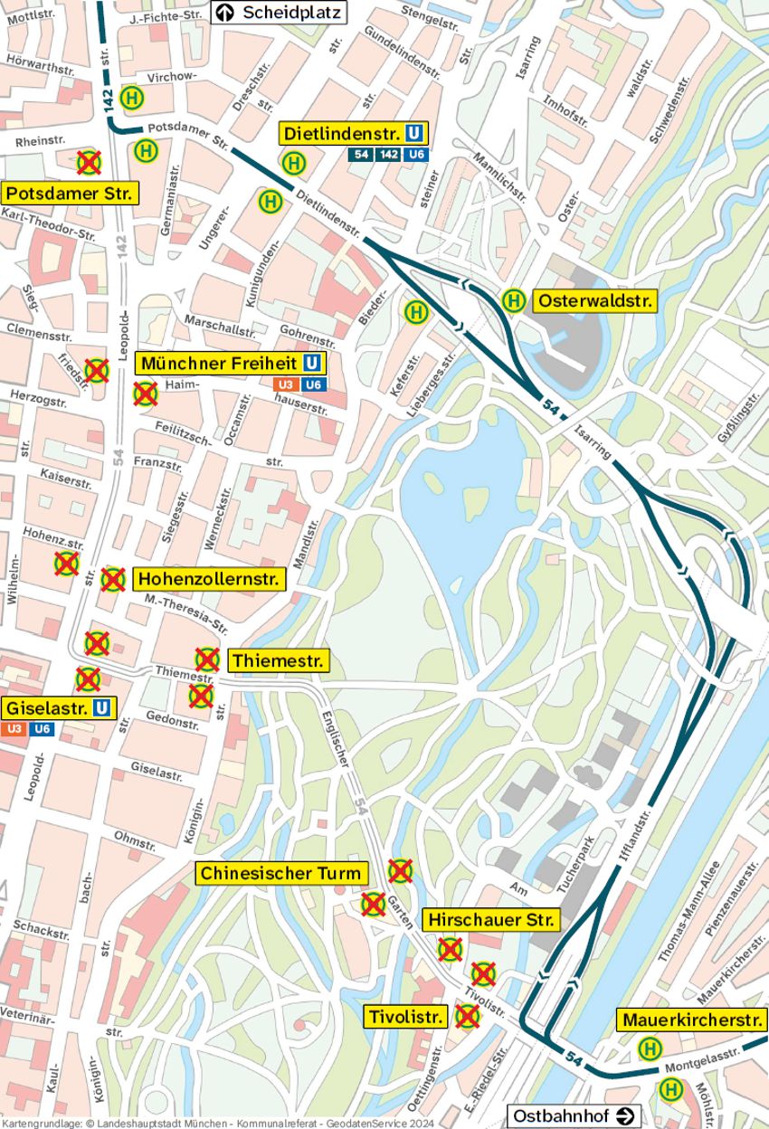 Die Buslinie 54 wird von ca. 11:30 bis 14 Uhr vom Ostbahnhof bzw. Herkomerplatz kommend ab Mauerkircherstraße über den U-Bahnhof Dietlindenstraße zum Scheidplatz umgeleitet bzw. fahren ab Dietlindenstraße weiter als Buslinie 142 zum Scheidplatz.
