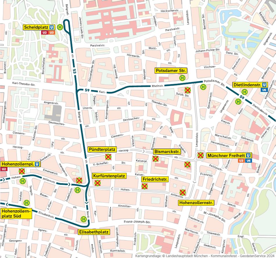 Die (H) Potsdamer Straße ist in Richtung Dietlindenstraße an die Haltestelle der Buslinie 59 > Giesing Bf. verlegt, die (H) Münchner Freiheit entfällt.