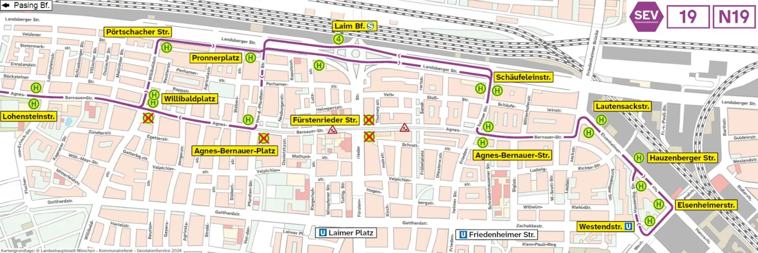 Der Ersatzbus 19 / N19 wird in Richtung Westendstraße bis vsl. Sonntag, 19. Dezember 2025 weiterhin ab Laim Bf. via Schäufeleinstraße zur Agnes-Bernauer-Straße umgeleitet.