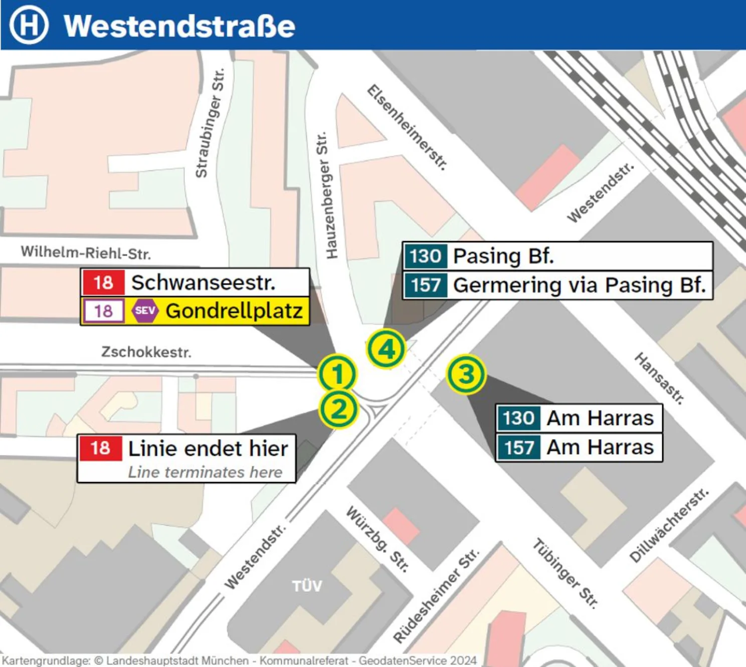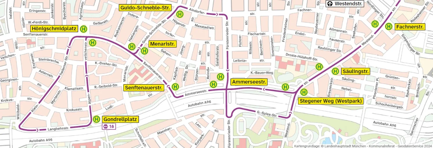 ⇒ Westendstraße: Ersatzhaltestelle vor Westendstraße 223b, nach Einmündung Altdorferstraße