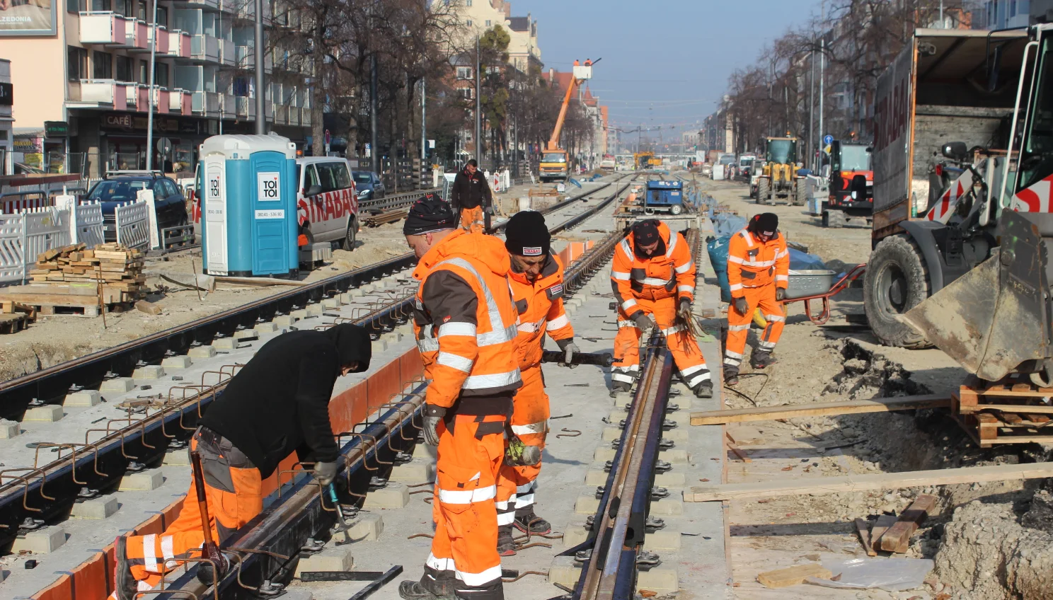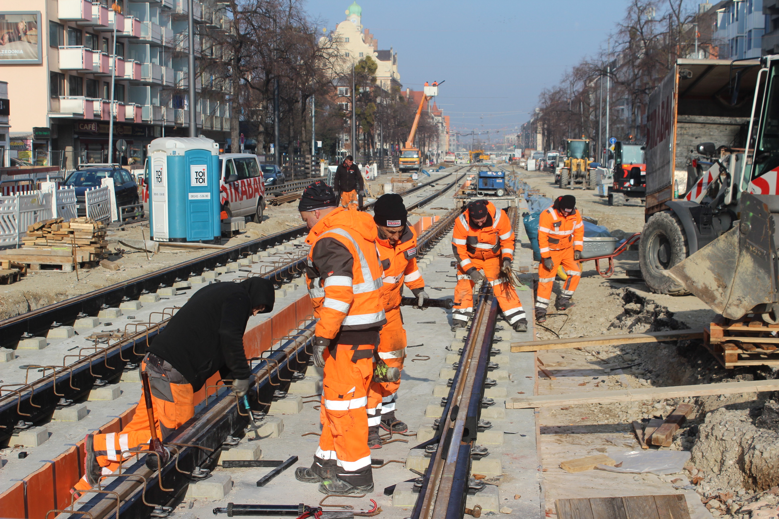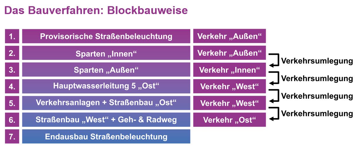 Nach dem Aufbau der provisorischen Straßenbeleuchtung werden zunächst die Versorgungsleitungen (Sparten) sowie die Hauptwasserleitung 5 verlegt. Die Verkehrsanlage, zu der Gleise, Oberleitung und Haltestellen gehören, bauen wir zusammen mit den inneren Autospuren, während wir den laufenden Straßenverkehr auf die äußeren Spuren verschwenken.