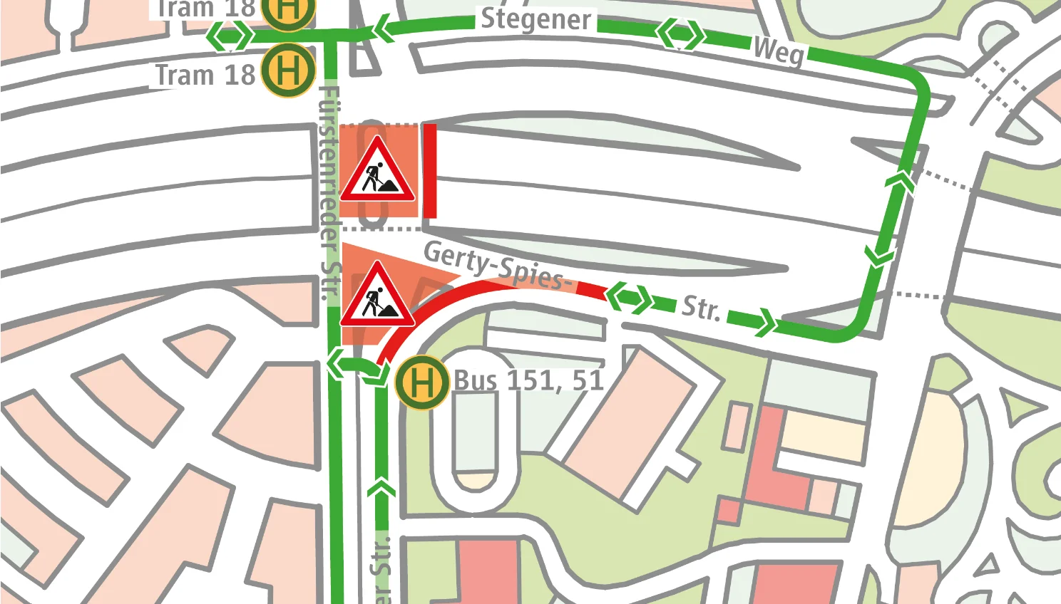 Während der Bauarbeiten kommt es regelmäßig zu Verlegungen der Bushaltestellen der Linien 51, 151 und 168.